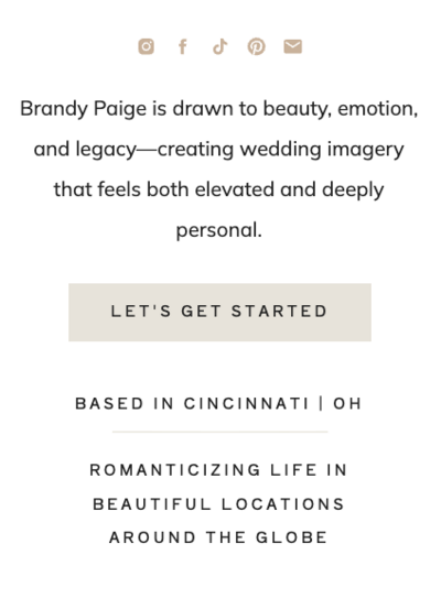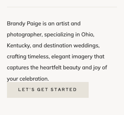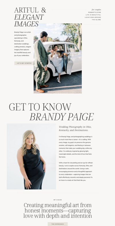 Brandy Paige is an Ohio wedding photographer whose previous website no longer reflected the level of her work. Built from DIY curation, it felt misaligned with the fine art, editorial quality of her imagery and lacked the refinement needed to connect with the luxury clients she serves today.